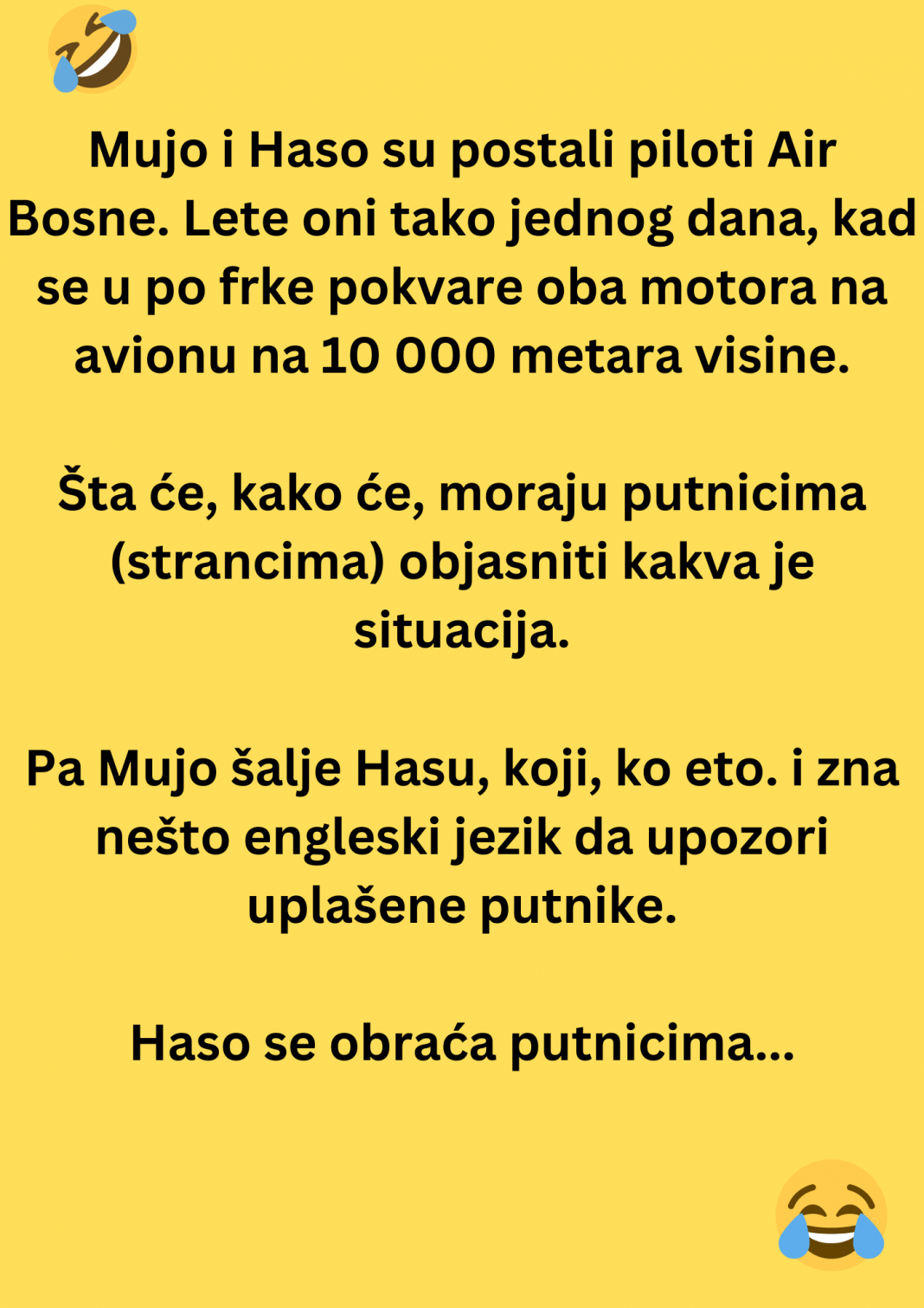 U prvoj bosanskohercegovačkoj avio-kompaniji Air Bosna, dogodilo se nešto što ni najiskusniji kontrolori leta ne bi znali klasifikovati – Mujo i Haso su dobili posao pilota. Da, dobro ste pročitali. Bosanski tandem iz kafanske legende sjeo je u kokpit aviona sa 180 putnika i – naravno – ništa nije moglo proći bez urnebesnog zapleta.