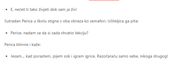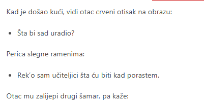 - Kada ga učiteljica pita šta bi želeo da radi kad poraste, Perica, pun entuzijazma, odgovara kako bi voleo da živi lagodno, pije energijska pića i „muvava“ devojke. Na prvi pogled, to zvuči kao vesela i bezbrižna budućnost, no učiteljica, naravno, nije oduševljena njegovim odgovorom. Reakcija učiteljice nije izostala, a Perica je došao kući sa crvenim otiskom na obrazu. Otac ga je, međutim, dočekao sa još većom reakcijom, želeći da ga nauči životnoj lekciji. Nakon još jednog šamara, otac mu poručuje: „E, nećeš ti tako živeti dok sam ja živ!“
