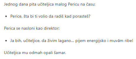 Ovaj vic o Perici nas podseća na to koliko ponekad naši snovi o tome šta ćemo biti kad porastemo mogu biti pomalo naivni, a realnost nas često brzo vrati na zemlju.