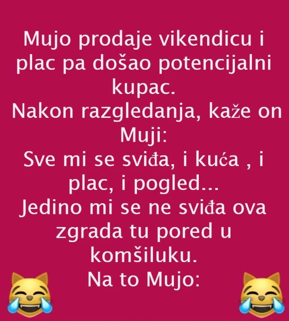 - Na Balkanu, gdje su vikendice simbol opuštanja i okupljanja, Mujo je imao svoje mjesto gdje je često sa prijateljima proslavljao male i velike životne radosti. Ipak, došlo je vrijeme kada je morao prodati svoju vikendicu, no pri tom je naišao na jednog kupca koji je postavio pitanje koje nikako nije očekivao – pitanje o susjedstvu. Iako je to bilo možda najbanalnije pitanje koje možete postaviti kad kupujete kuću, odgovor koji je Mujo dao, potpuno je iznenadio.
