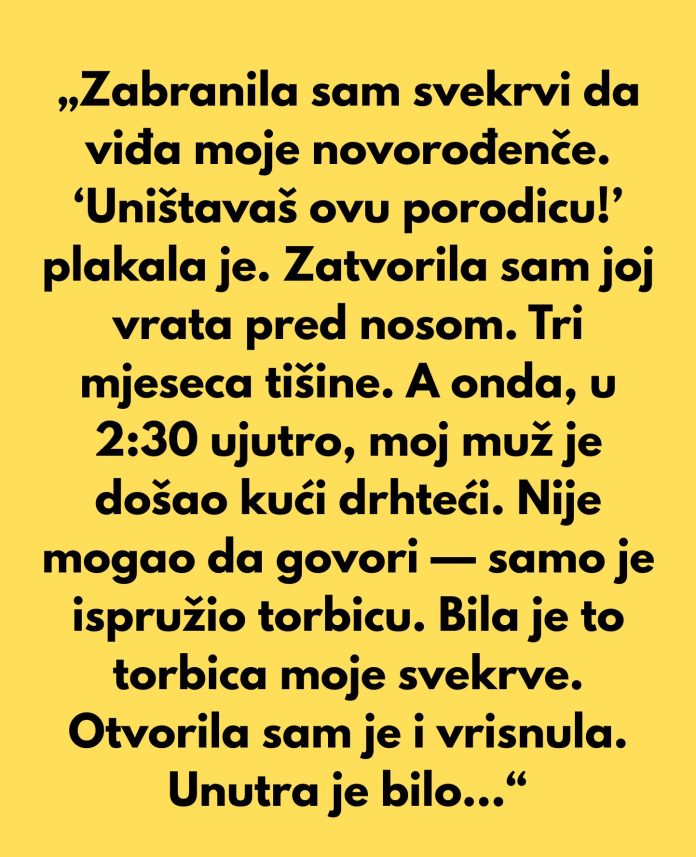 No, jednog dana, u 2:30 ujutro, muž se vratio kući s torbicom u ruci. Njegovo drhtanje nije promaklo njegovoj ženi, a ni njegovu tišinu nije mogla da ignoriše. Pružio joj je torbicu – torbicu koju je ona prepoznala kao torbicu svoje svekrve. Kad je otvorila torbicu, unutra je bilo ćebence za bebu koje je svekrva plela mesecima, sa porukom koja je nosila duboku i emotivnu poruku: “Prešla sam granicu. Bila sam toliko uzbuđena što ću biti baka da sam zaboravila da si ti majka. Ovo je za onda kada budeš spremna.” U tom trenutku, srce mlade majke nije izdržalo. Suze su joj potekle, a ćebence je držala u rukama kao simbol ljubavi i kajanja koje su obeležile celu situaciju.