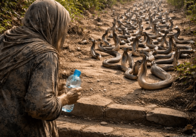 Kako su kapi padale, zmija je počela da pije. Pokreti su joj postajali sigurniji, život se polako vraćao u njeno tijelo. Žena je posmatrala prizor, i na trenutak zaboravila na strah.